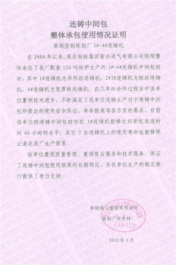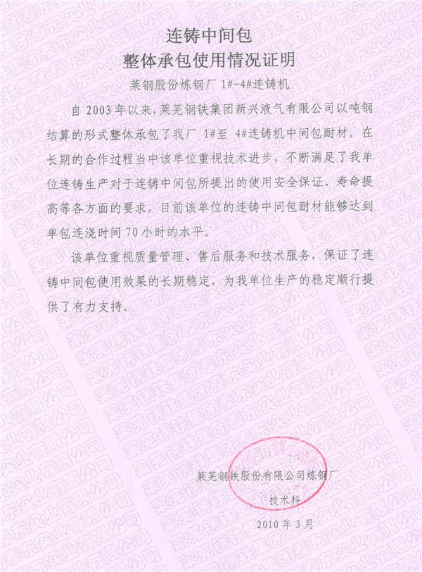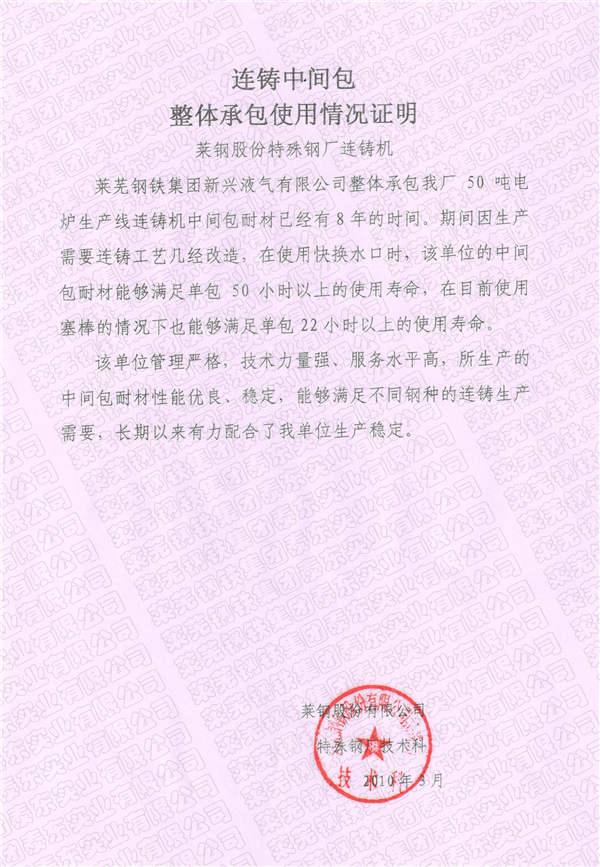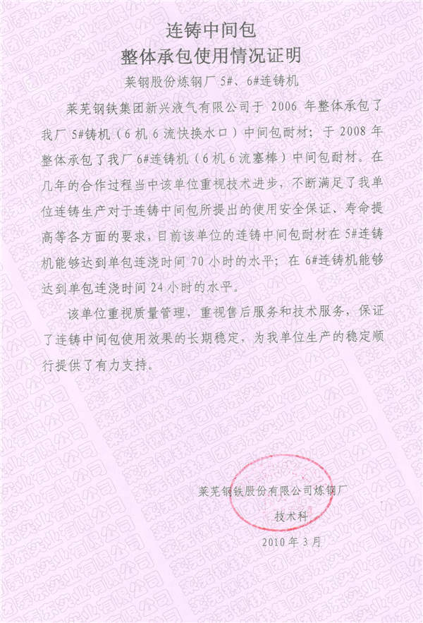 公司以雄厚的技術(shù)力量承擔(dān)著萊鋼全部12臺連鑄機中間包耐火材料的整體承包服務(wù),經(jīng)過多年的發(fā)展,公司已經(jīng)形成了對連鑄中間包耐火材料方案設(shè)計、生產(chǎn)、研發(fā)、現(xiàn)場施工及售后服務(wù)為一體的綜合體系。目前,在萊鋼中間包連拉爐數(shù)更是突破100小時,達(dá)到國內(nèi)領(lǐng)先水平。